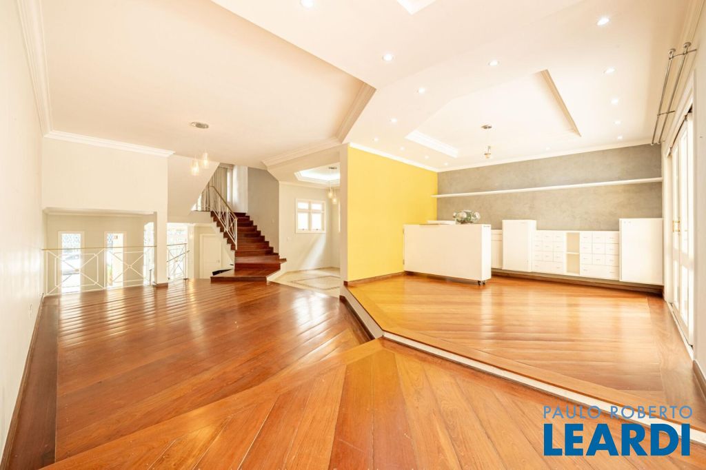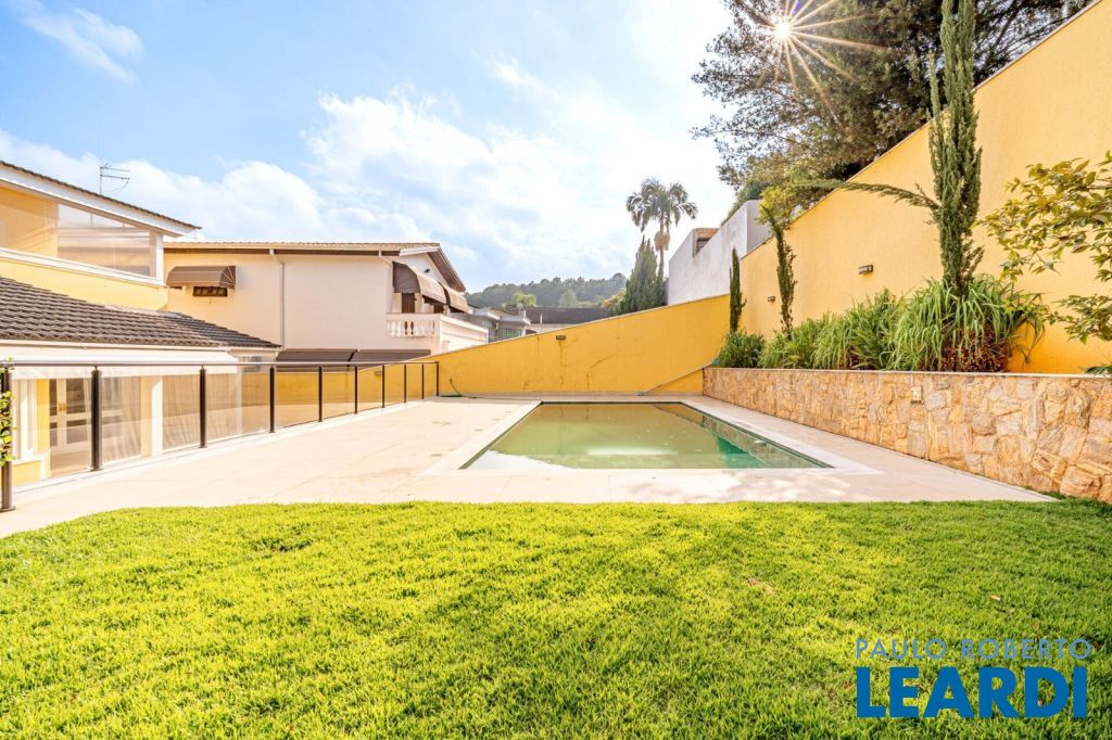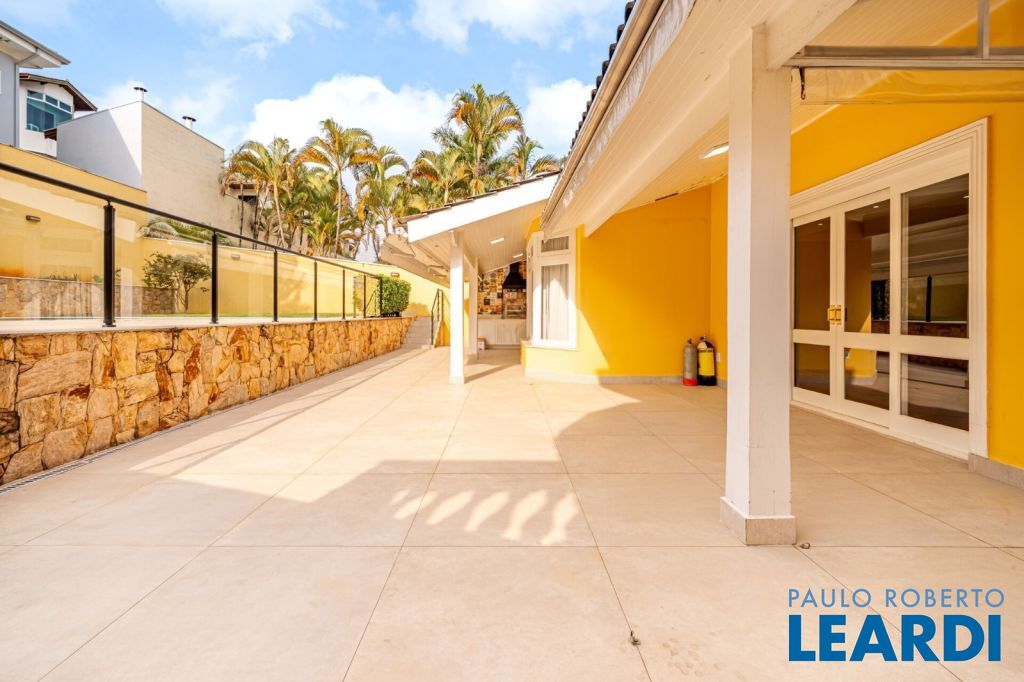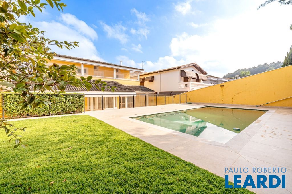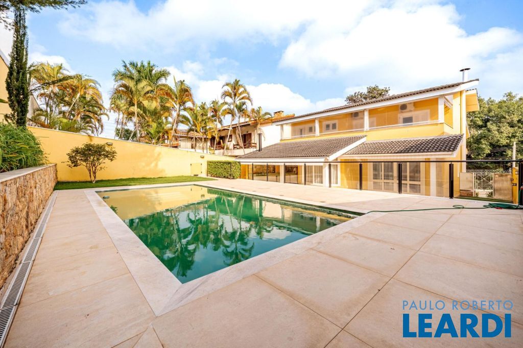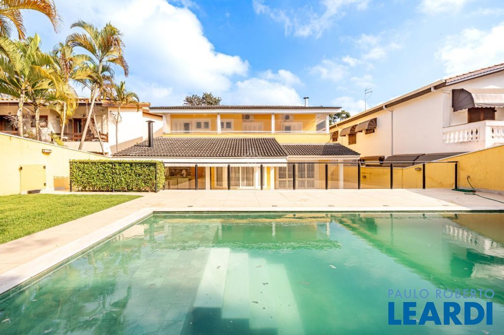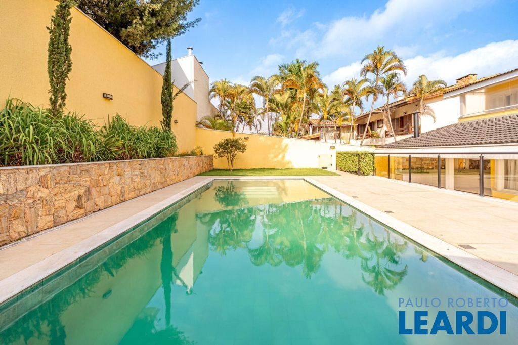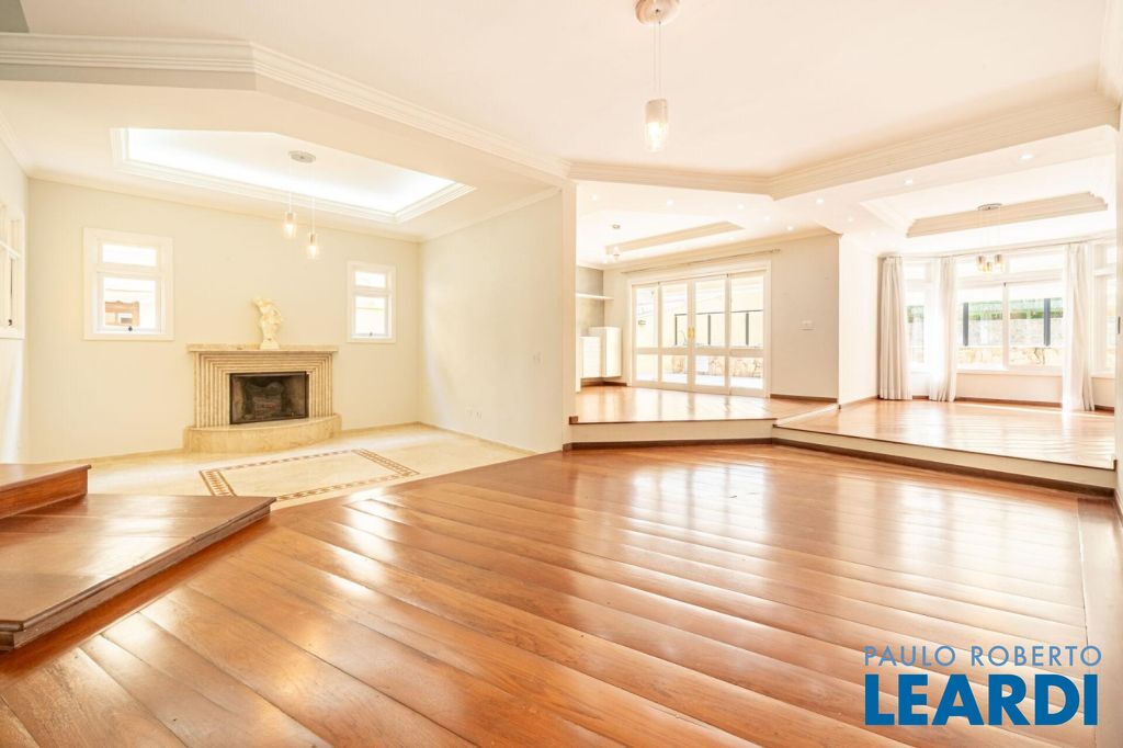 master com closet e varanda, living para 3 ambientes, sala de estar, sala de jantar, sala de TV, lareira, escritório, cozinha, copa, lavabo, área de serviço, dependência de funcionário, espaço gourmet, piscina, deck molhado, churrasqueira, 2 vagas cobertas na garagem, área de terreno 608 m², área construída 470 m².